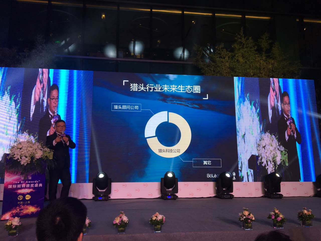 伯乐CEO Pierre Zhuang 庄华先生代表伯乐领奖;猎聘高级副总裁邢子培Renee小姐为其颁奖